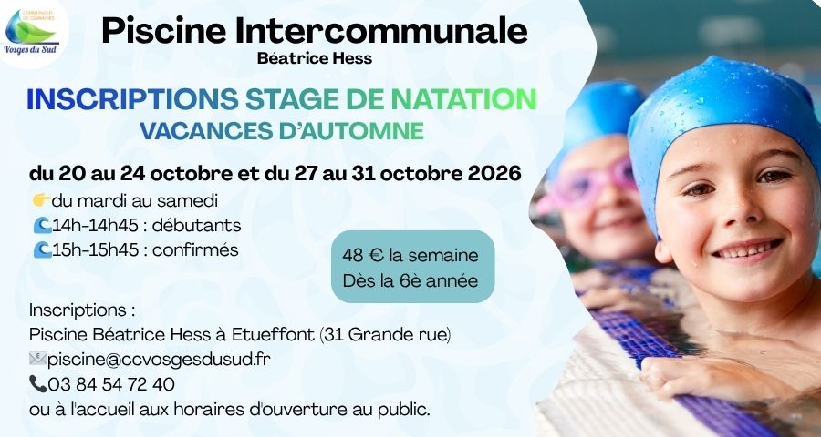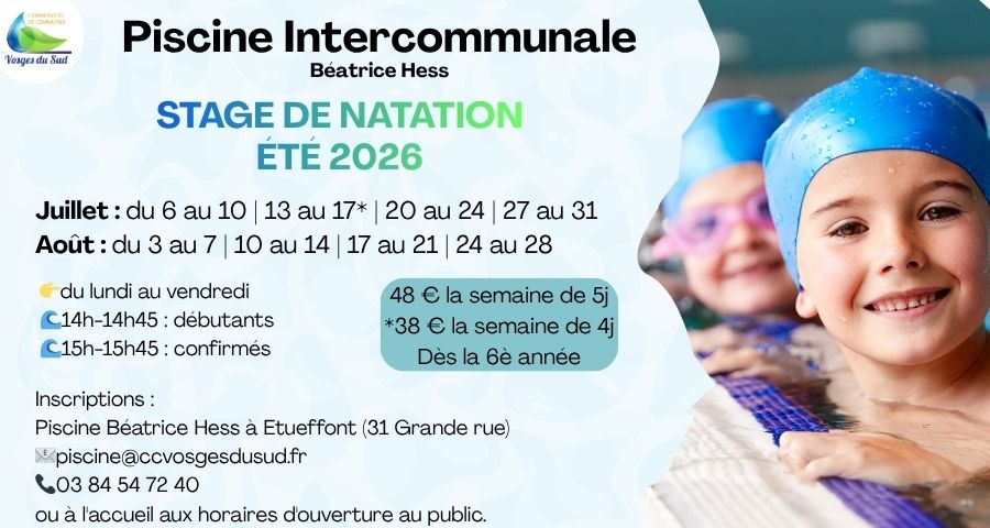 Renseignements et inscription : au 03 84 54 72 40 ou directement à l’accueil de la piscine aux horaires d’ouverture public.